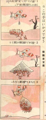 『家の光』昭和12年11月号より なんというか「飛行機をナメとんのか」画像であります。投網をどうやって閉じるのか、どうして人間が網にかかるのか。技術的には大きな問題があると思います。お約束ですが。このマンガのネタは読者の投稿によるものだそうです…
