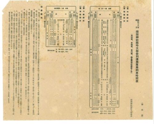 昭和18年4月靖国神社臨時大祭遺族行動一覧表 昭和18年4月の靖国神社臨時大祭実行委員会からの「招待状」に同封されていたものには、臨時大祭期間中の遺族のタイムスケジュールも入っていた。 A3のわら半紙に活版刷りのもので、大きなサイズのものを>>こ…